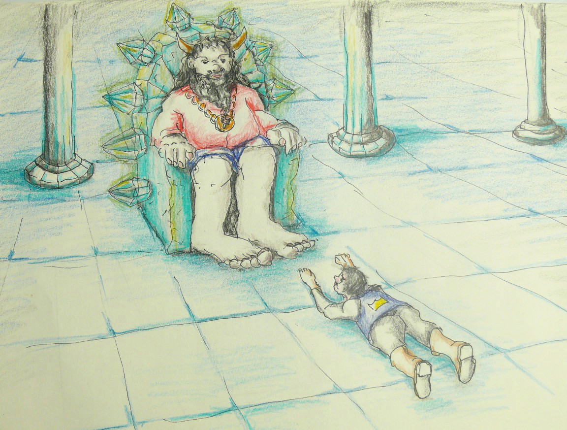 Aus den Rauchschwaden erhebt sich unter mächtigen Flügelschlägen der schlangenartige Körper des Drachen in die Lüfte. In der Mitte des Vulkans hielt er inne und sprach mit einer Stimme, die den ganzen Berg erzittern ließ: „Wie könnt ihr es wagen? Kein Sterblicher darf dieses Reich betreten, ohne bestraft zu werden. Teilt mir nun euer Gesuch mit oder ich werde euch für immer vom Angesicht der Erde tilgen.“ Alle standen dort, wie erstarrt. Der Plan hatte nicht funktioniert. Der Drache starrte sie aus feuerroten Augen an. Der Gesandte plusterte sich auf und wollte grade zum Wort ansetzen, als ihn eine Hand zurückhielt. Er drehte sich um und öffnete erstaunt den Mund. Angesichts der veränderten Situation, hatte der König, der zu seiner eigenen Sicherheit am Eingang des Vulkans gewartet hatte, beschlossen sich ebenfalls ins Geschehen einzumischen. „Lass mich mit ihm sprechen,“ sagte er zum Botschafter sanft. „Er hat das Land schon zu lange terrorisiert.“ Er trug nur eine schlichte metallene Rüstung und strahlte doch eine unglaubliche Macht und Weisheit aus. Nun wendete er das Wort an den Drachen: „Du hast so viele Königreiche in Flammen aufgehen lassen mitsamt íhren Bewohnern. Die Menschen leben schon lange in Schrecken vor dieser rücksichtslosen zerstörerischen Macht. Es muss aufhören. Also wirst du heute, hier an diesem Ort sterben.“
