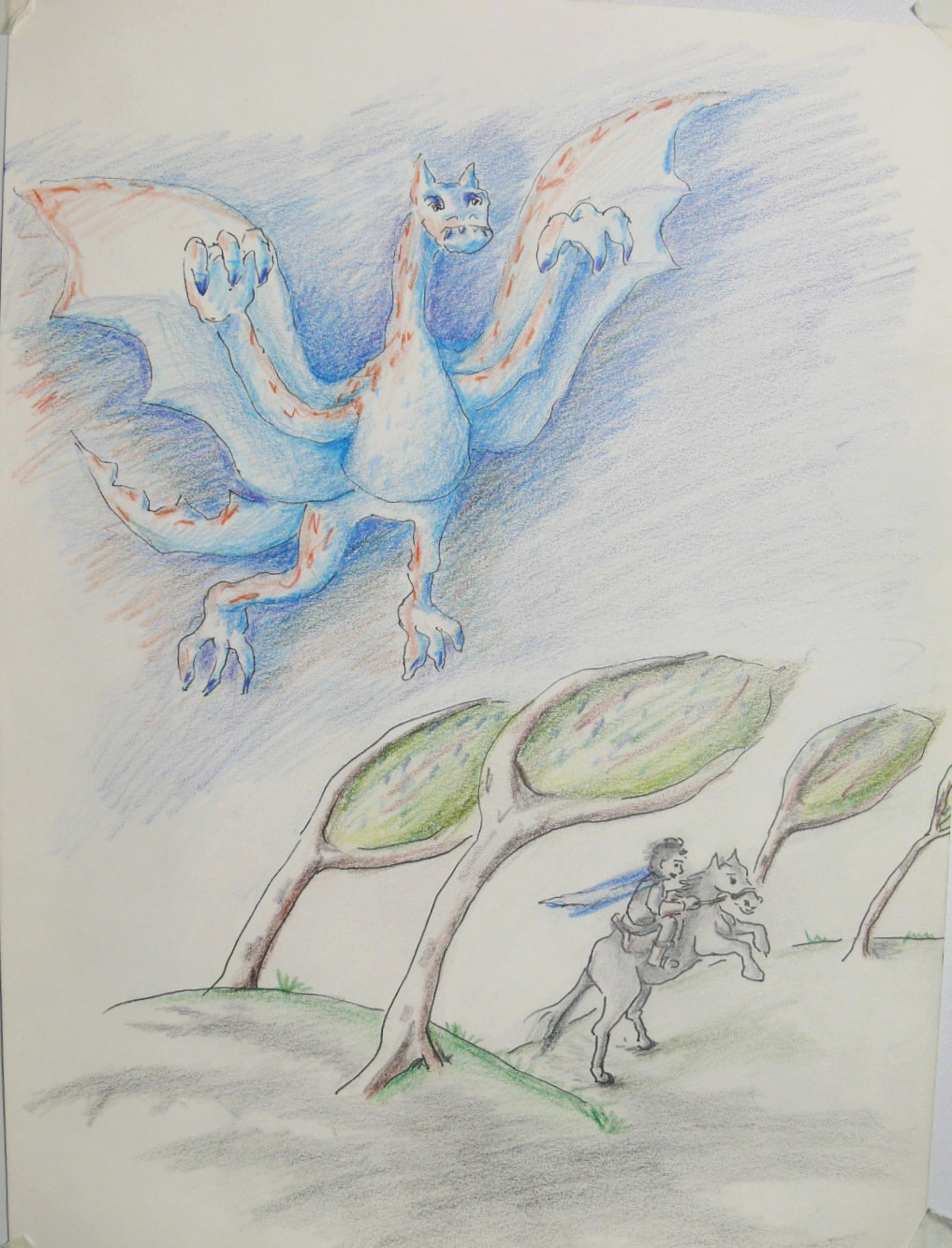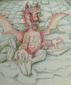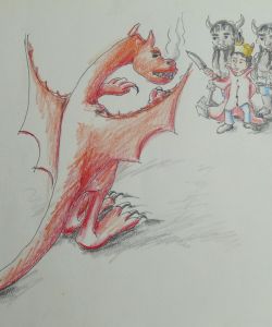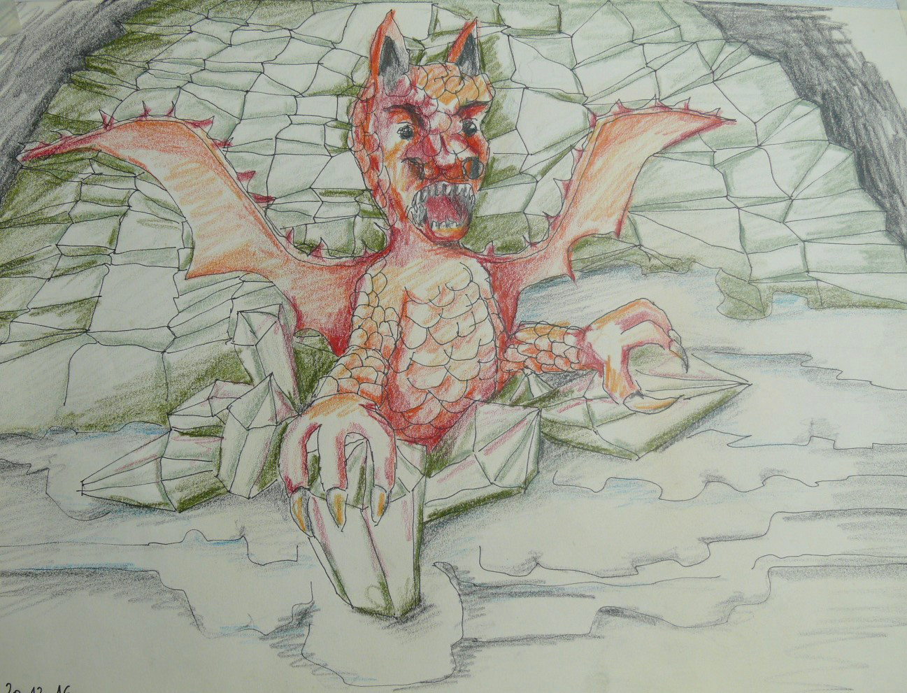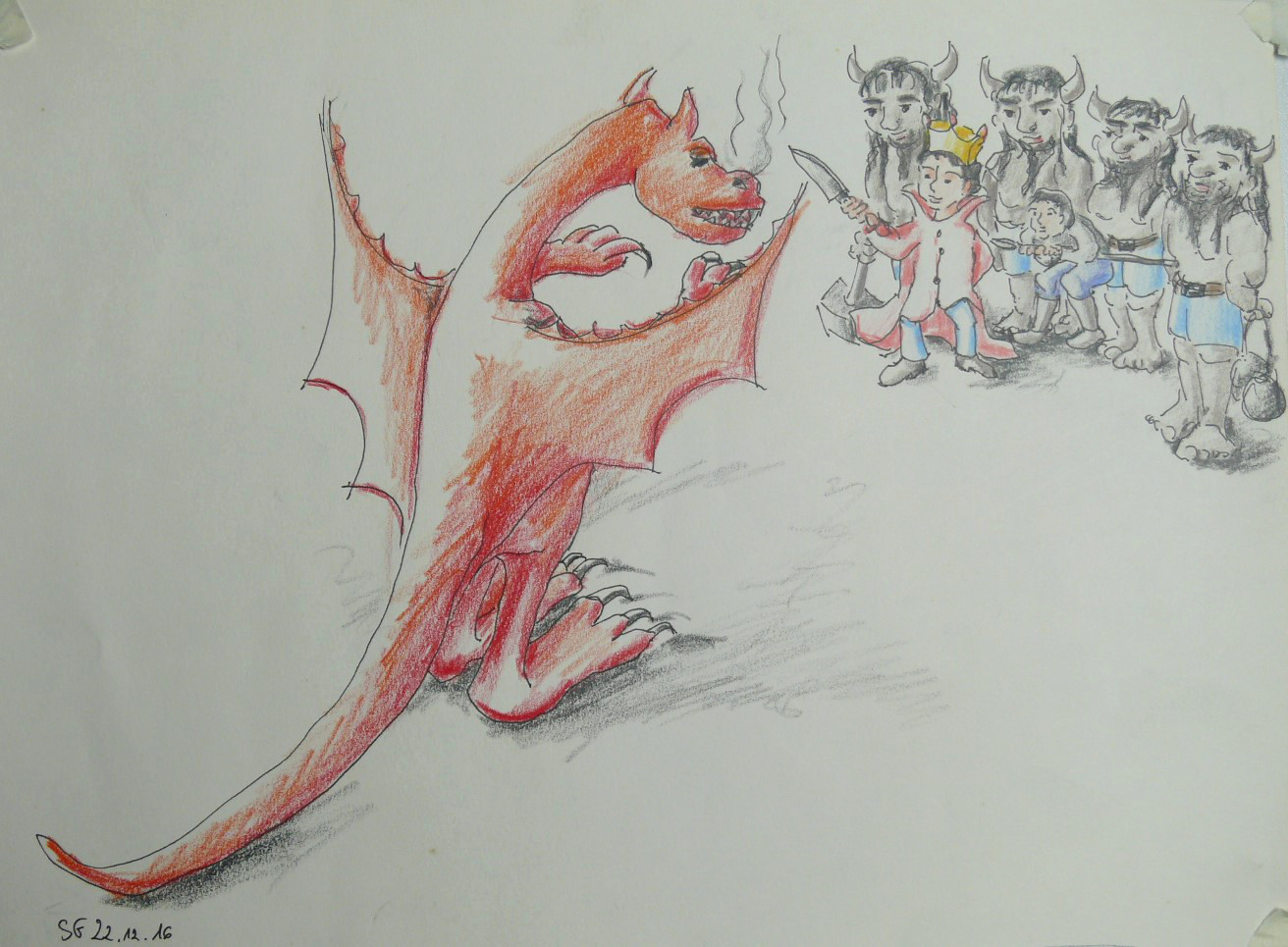 Aus den Rauchschwaden erhebt sich unter mächtigen Flügelschlägen der schlangenartige Körper des Drachen in die Lüfte. In der Mitte des Vulkans hielt er inne und sprach mit einer Stimme, die den ganzen Berg erzittern ließ: „Wie könnt ihr es wagen? Kein Sterblicher darf dieses Reich betreten, ohne bestraft zu werden. Teilt mir nun euer Gesuch mit oder ich werde euch für immer vom Angesicht der Erde tilgen.“ Alle standen dort, wie erstarrt. Der Plan hatte nicht funktioniert. Der Drache starrte sie aus feuerroten Augen an. Der Gesandte plusterte sich auf und wollte grade zum Wort ansetzen, als ihn eine Hand zurückhielt. Er drehte sich um und öffnete erstaunt den Mund. Angesichts der veränderten Situation, hatte der König, der zu seiner eigenen Sicherheit am Eingang des Vulkans gewartet hatte, beschlossen sich ebenfalls ins Geschehen einzumischen. „Lass mich mit ihm sprechen,“ sagte er zum Botschafter sanft. „Er hat das Land schon zu lange terrorisiert.“ Er trug nur eine schlichte metallene Rüstung und strahlte doch eine unglaubliche Macht und Weisheit aus. Nun wendete er das Wort an den Drachen: „Du hast so viele Königreiche in Flammen aufgehen lassen mitsamt íhren Bewohnern. Die Menschen leben schon lange in Schrecken vor dieser rücksichtslosen zerstörerischen Macht. Es muss aufhören. Also wirst du heute, hier an diesem Ort sterben.“