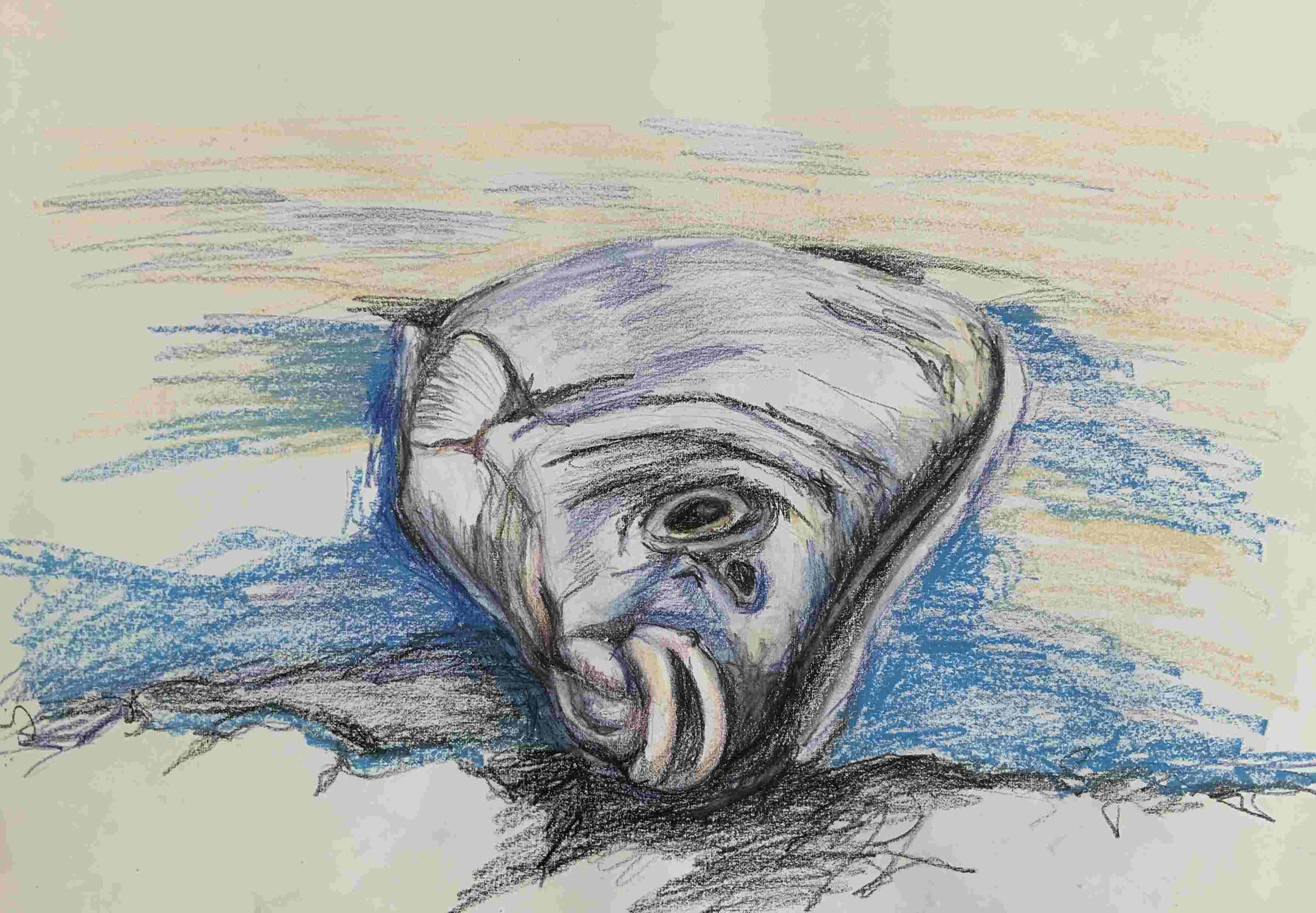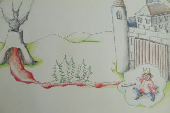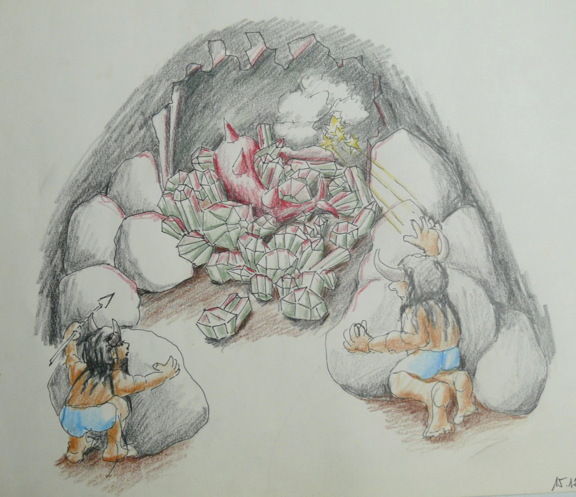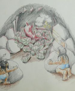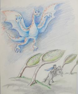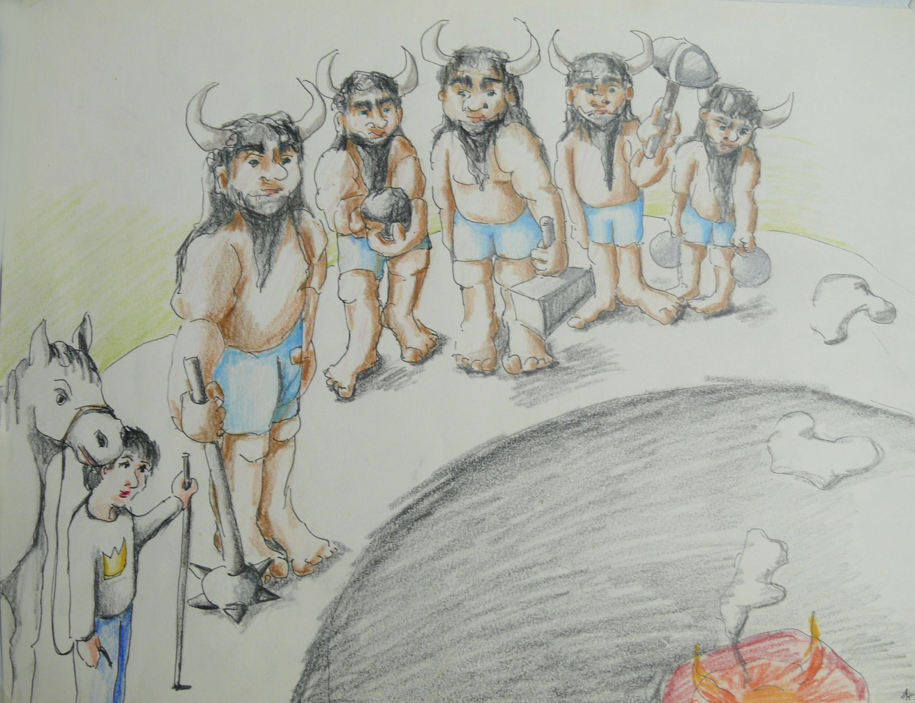 Aus den Rauchschwaden erhebt sich unter mächtigen Flügelschlägen der schlangenartige Körper des Drachen in die Lüfte. In der Mitte des Vulkans hielt er inne und sprach mit einer Stimme, die den ganzen Berg erzittern ließ: „Wie könnt ihr es wagen? Kein Sterblicher darf dieses Reich betreten, ohne bestraft zu werden. Teilt mir nun euer Gesuch mit oder ich werde euch für immer vom Angesicht der Erde tilgen.“ Alle standen dort, wie erstarrt. Der Plan hatte nicht funktioniert. Der Drache starrte sie aus feuerroten Augen an. Der Gesandte plusterte sich auf und wollte grade zum Wort ansetzen, als ihn eine Hand zurückhielt. Er drehte sich um und öffnete erstaunt den Mund. Angesichts der veränderten Situation, hatte der König, der zu seiner eigenen Sicherheit am Eingang des Vulkans gewartet hatte, beschlossen sich ebenfalls ins Geschehen einzumischen. „Lass mich mit ihm sprechen,“ sagte er zum Botschafter sanft. „Er hat das Land schon zu lange terrorisiert.“ Er trug nur eine schlichte metallene Rüstung und strahlte doch eine unglaubliche Macht und Weisheit aus. Nun wendete er das Wort an den Drachen: „Du hast so viele Königreiche in Flammen aufgehen lassen mitsamt íhren Bewohnern. Die Menschen leben schon lange in Schrecken vor dieser rücksichtslosen zerstörerischen Macht. Es muss aufhören. Also wirst du heute, hier an diesem Ort sterben.“