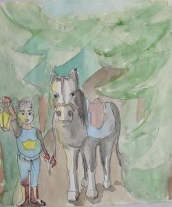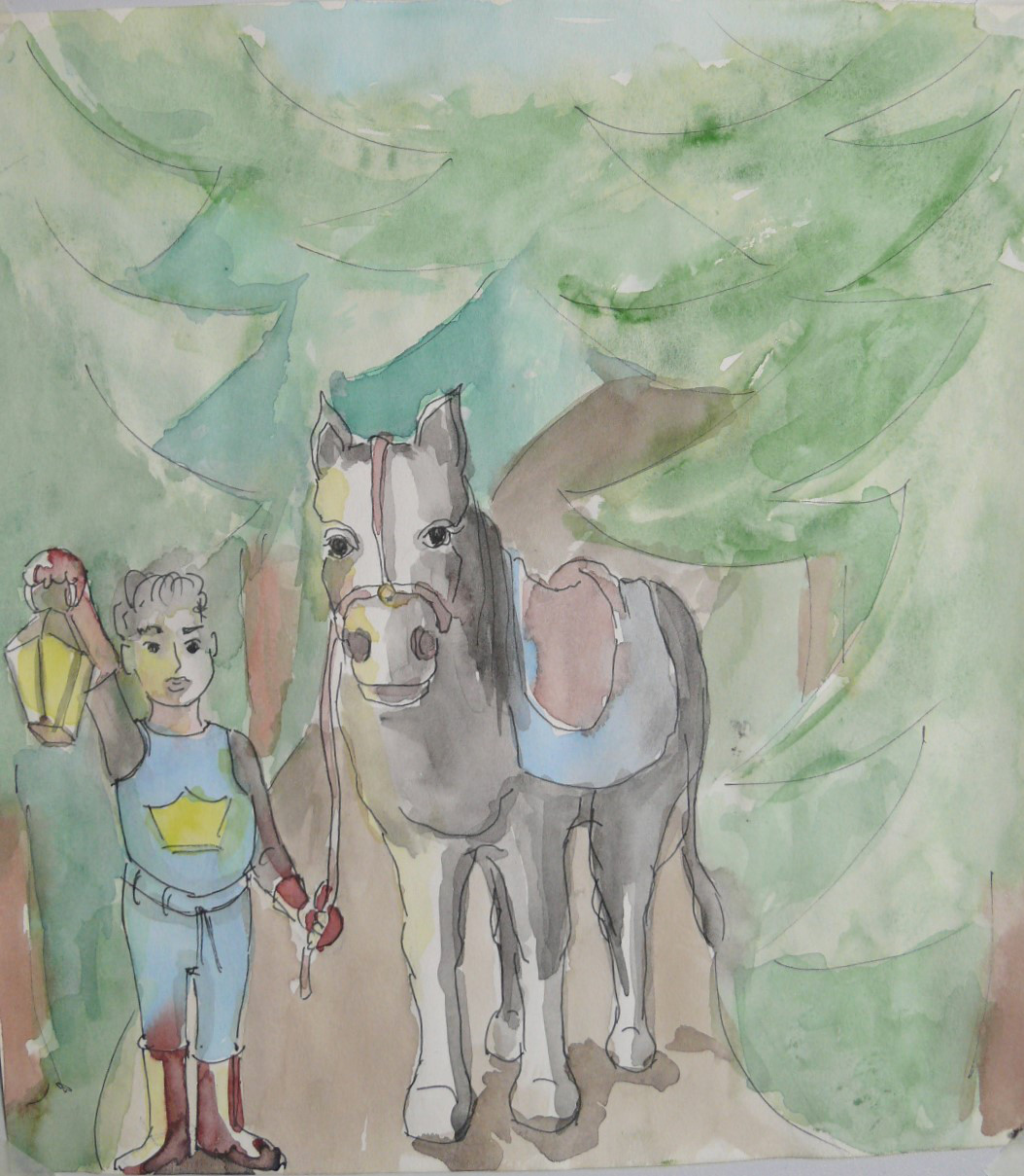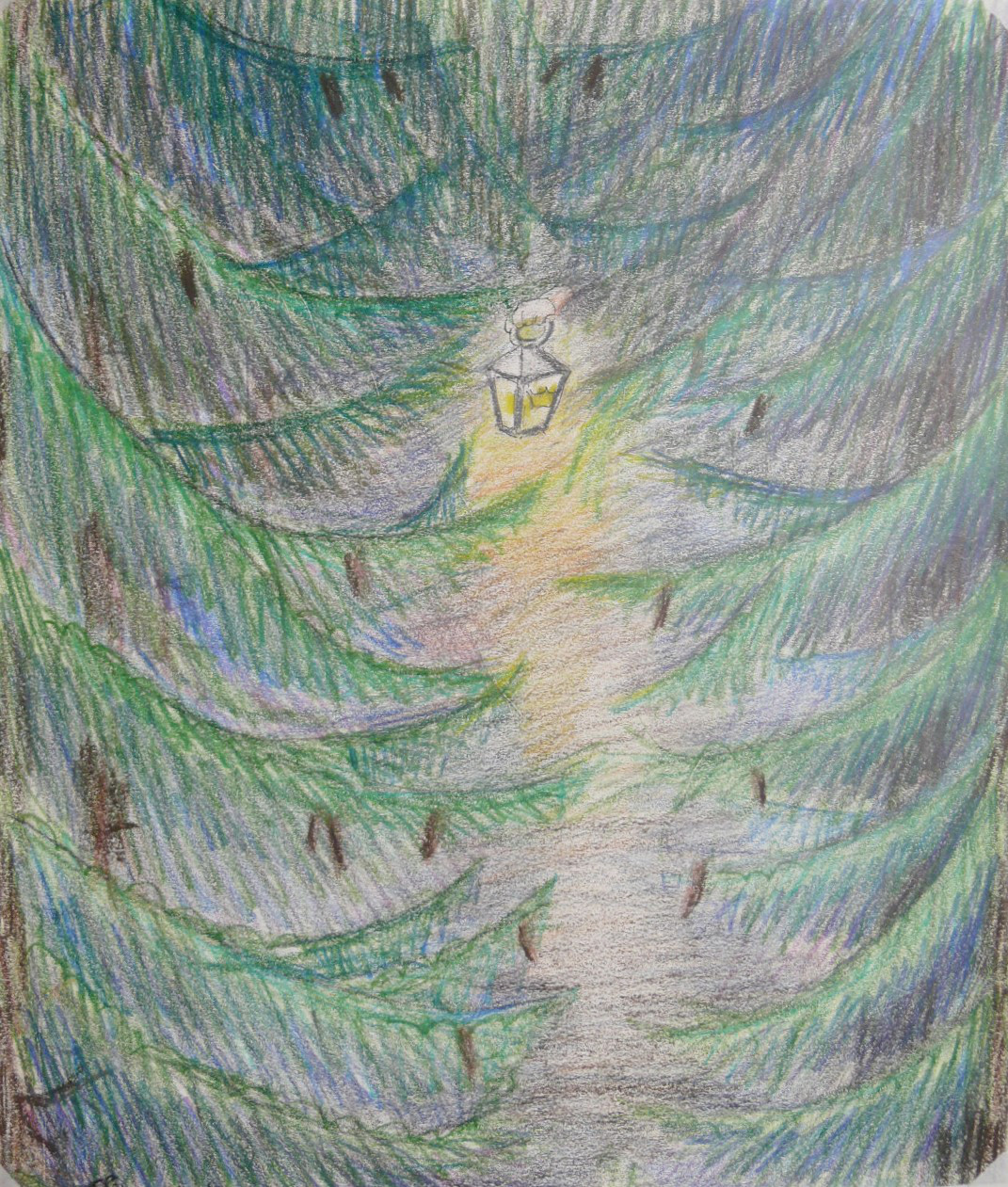 "Eines kühlen Wintermorgens, der Tau tropfte von den Zweigen der Tannen, die schon so manches Jahrhundert überdauert hatten. Hin und wieder pfiff ein Wind durch den Wald und mit großem Zögern neigten sich die grünen Giganten unter lautem Ächtzen, um der Naturgewalt platz zu machen. Inmitten diesen Kampfes der Riesen sah man ein kleines, kaum erkennbareres Licht im Wald. Es war des Königs Botschafter. Er, der schon über 7 Berge ging, durch 7 Täler, der schon 7 Meere durchschwamm und 7 Wälder. Nun ist er schon ganz nah. Er lässt seinen Blick durch das dunkle Gehölz schweifen, was nur durch das warme Licht der Laterne an Struktur gewinnt. Sein Gesicht entspannt sich.