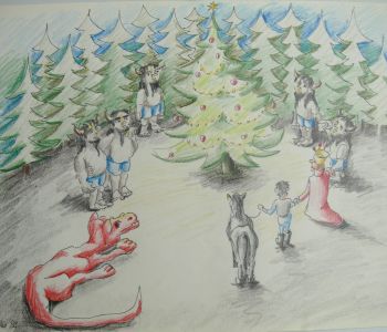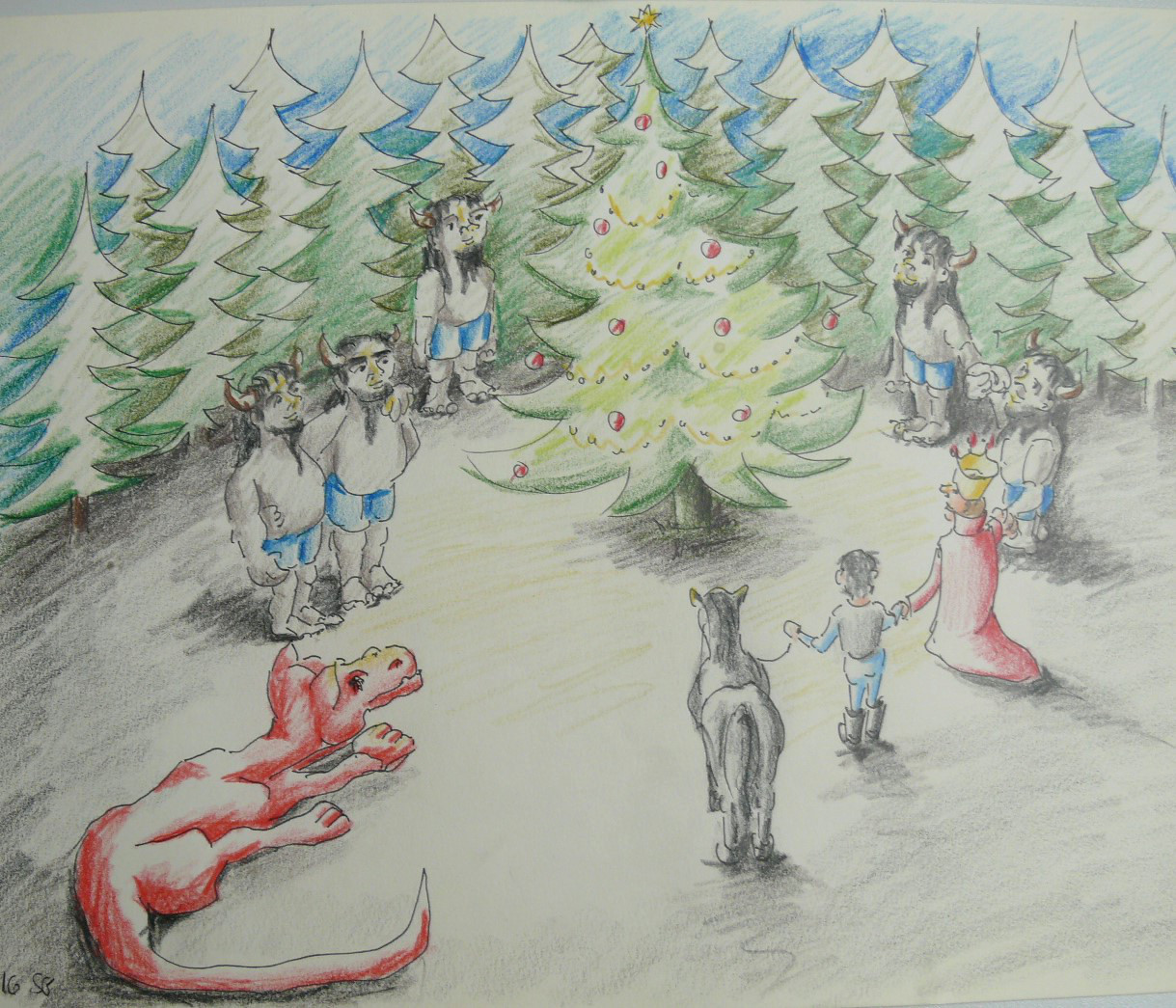 „Gibt es noch eine Chance für unsere Rasse ? Alles was du sagtest ist wahr, doch in uns steckt nach wie vor das Gute. Gib uns eine Chance es zu beweisen.“ „Ich kann euch nicht helfen,“ erwiderte der Drache. „Ihr müsst euch selbst helfen. Findet zurück zu eurer Natur. Zu den gütigen, auf seine Artgenossen achtenden Wesen, dass ihr mal wart. Welches riesige Königreiche erbaute und in Wohlstand lebte. Und nun verlasst mein Reich, Sterbliche! Wagt es nicht noch einmal diesen Ort, zu betreten!“ Die Decke brach auf und Lave floss in riesigen Schwaden hinab auf alle. Innerhalt weniger Momente war der gesamte Vulkan gefüllt. Die Trolle und Menschen erschraken, doch es verbrannte sie nicht. Es wurde dunkel. Der König erwachte. Er befand sich vor den Toren deines Königreichs. Er wusste was zu tun ist. Er erhob sich. Um ihn herum lag seine komplette Armee verstreut. Er betrat sein Königreich und ließ eine riesige Volksversammlung abhalten, um eine Ankündigung zu machen: „Wir werden ein Fest abhalten. Prächtig und atemberaubend. Jeder wird eingeladen, ob arm oder reich. Jeder gibt etwas dazu, aber nur so viel wie er kann. Die einen mehr, die anderen weniger. Wir wollen unserer Menschlichkeit gedenken und der Natur, die uns schuf. Lasst uns die 300 Jahre alte Tanne jenseits dieser Mauern als stärkste Bindung zur Natur zum Schauplatz des Festes wählen!“