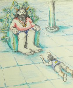 „Du arrogantes Säugetier!“ erwiderte der Drachen abfällig, „Du siehst nicht, was ich sehe. Eure Art ist dem Tode geweiht. Zerfressen von Gier, Lust und Egoismus. Alle Königreiche, die unter meinen Flammen untergingen, enthielten keine Menschen, sondern Monster. Ich erhielt die Macht, die alles und jeden überdauert von Mutter Natur selbst, mit der Aufgabe die Welt von eurer Plage rein zu waschen. Doch dies ist der ultimative Beweis, warum ihr diese Peinigung auch tatsächlich verdient habt. Ihr habt eine völlig unschuldige, unbeteiligte Rasse ebenfalls dem Untergang geweiht, indem ihr sie mit hierher brachtet.“ Der König schwieg für einen Augenblick und dachte über das Gesagte nach.