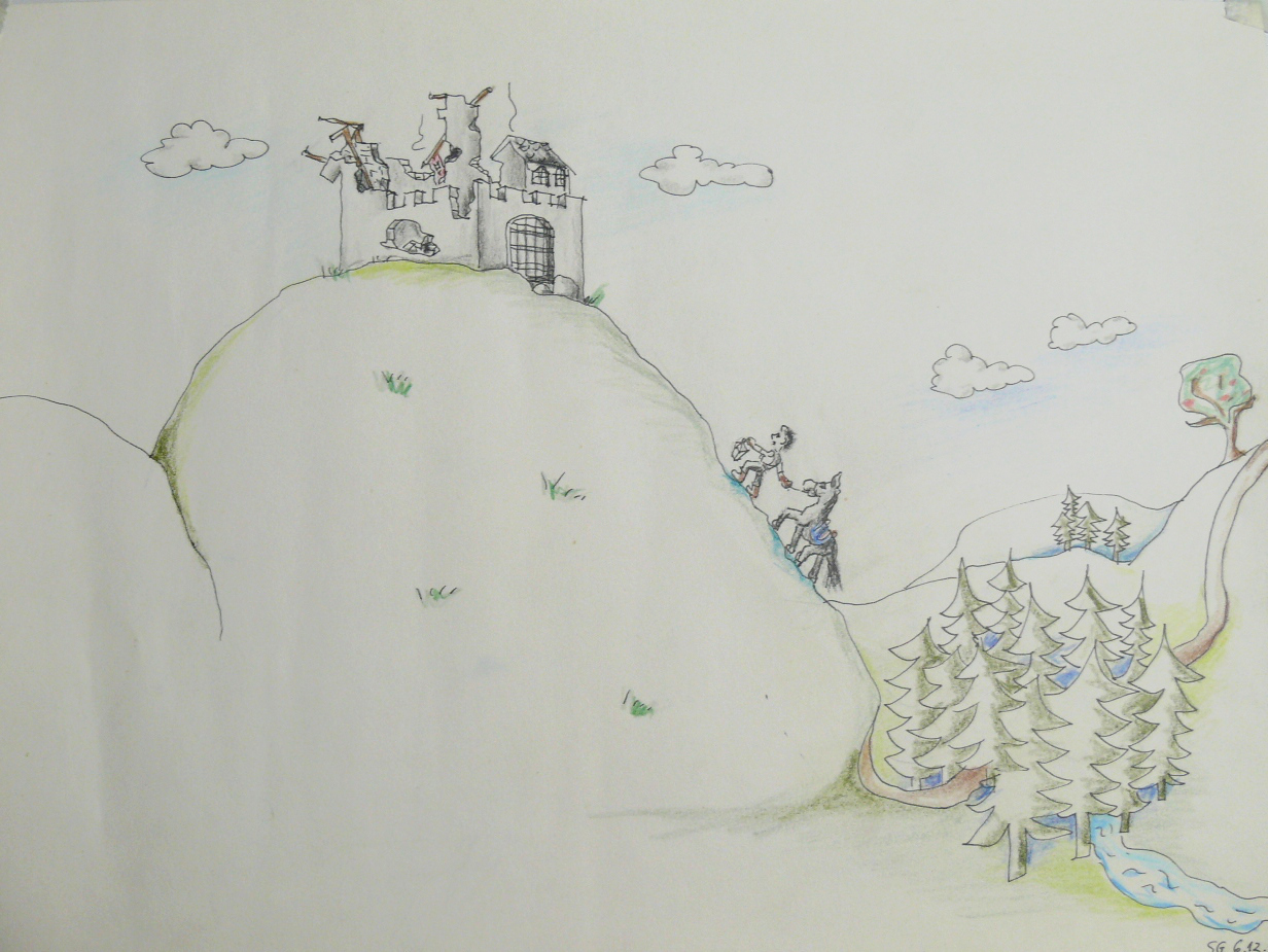 Einige Zeit verstrich und er ritt noch ein paar Meilen. Dann endlich, als er zum ersten Mal das Schloss erblickte verschwand sein Lächeln und er wurde kreidebleich. Vom ehemals prunkvollen Schloss waren nur noch qualmende Ruinen übrig. Er erbleichte vor Angst. Dieses Schloss ebenfalls ? Wie viele sollen denn noch folgen ? Wie lange soll die Menschheit noch weiter gequält werden ? Der Himmel wechselte plötzlich von einem seichten himmelblau zu pechschwarz. Von blanker Angst gepackt, riss der Botschafter sein Ross herum und floh in schnellem Galopp. Am Himmel erschien er nun. Der feuerrote Schrecken, Zerstörer von Welten Ismael der Drache. Nach der erfolgreichen Flucht versank der Botschafter in tiefen Gedanken. Ihm musste endlich Einhalt geboten werden. Er beschloss, dass es nur einen möglichen Weg geben konnte diesen Schrecken für immer zu verbannen. Corgar, König der Trolle. Nach 2 vollen Monden erreichte er den Berg Uldaman...."